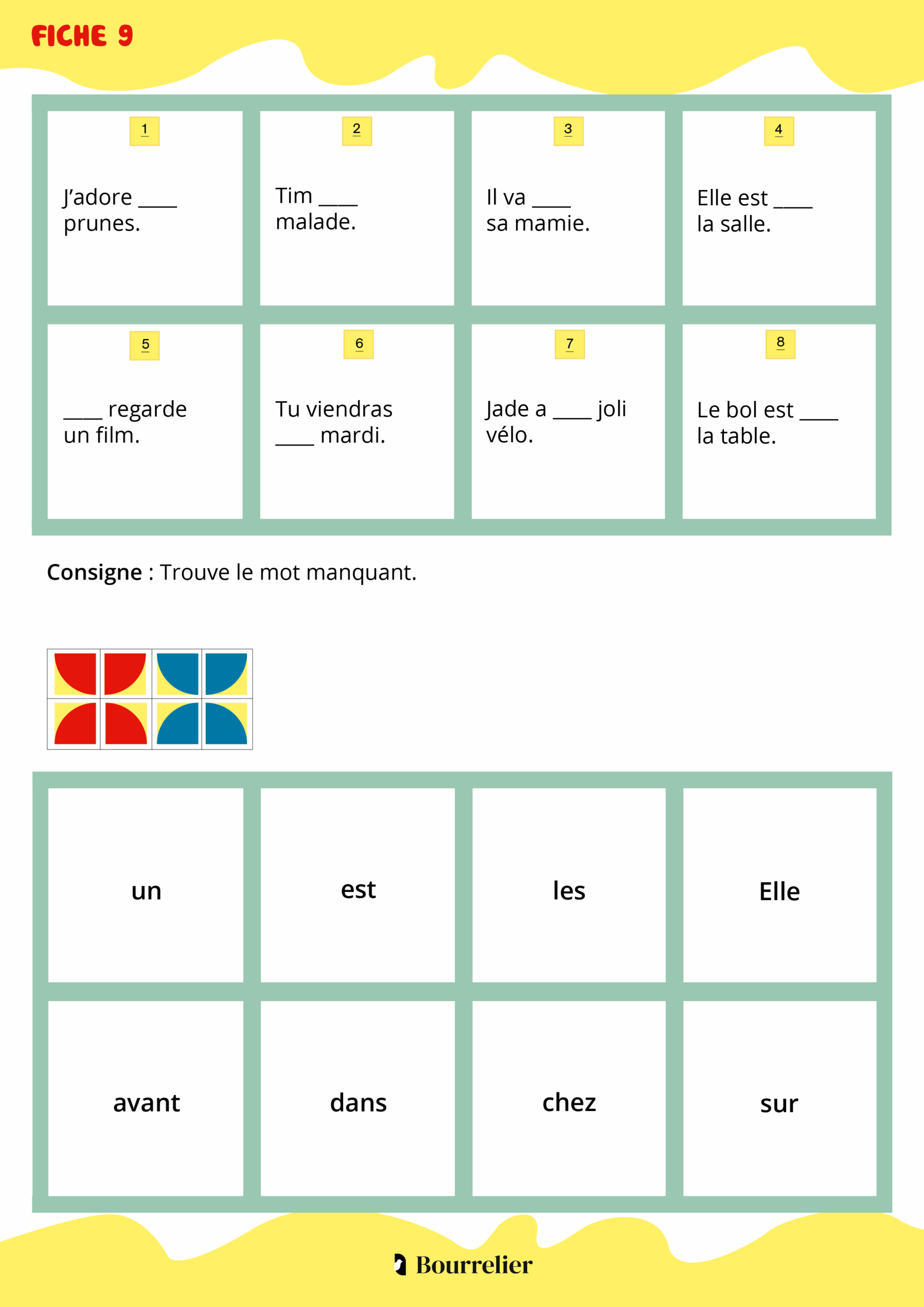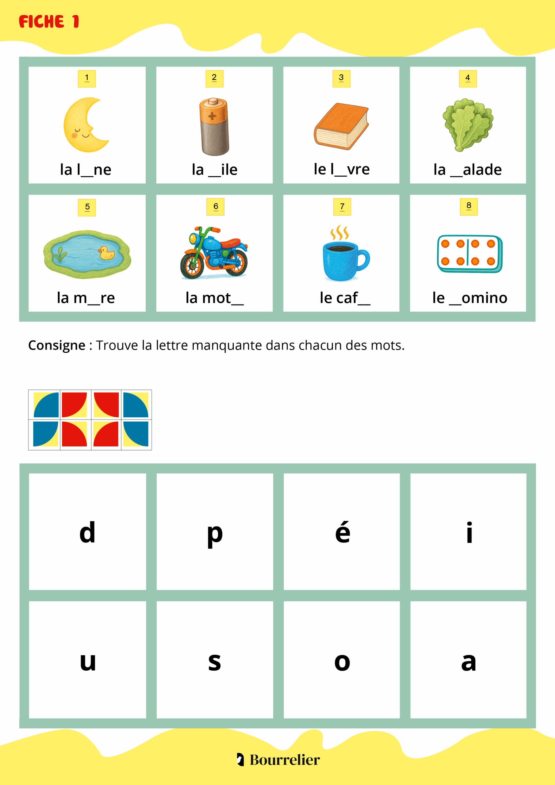 - Si le motif correspond au modèle présenté sur la fiche l’élève sait qu’il a réussi l’activité. Si le motif ne correspond pas, il repère les réponses incorrectes et se corrige tout seul.
