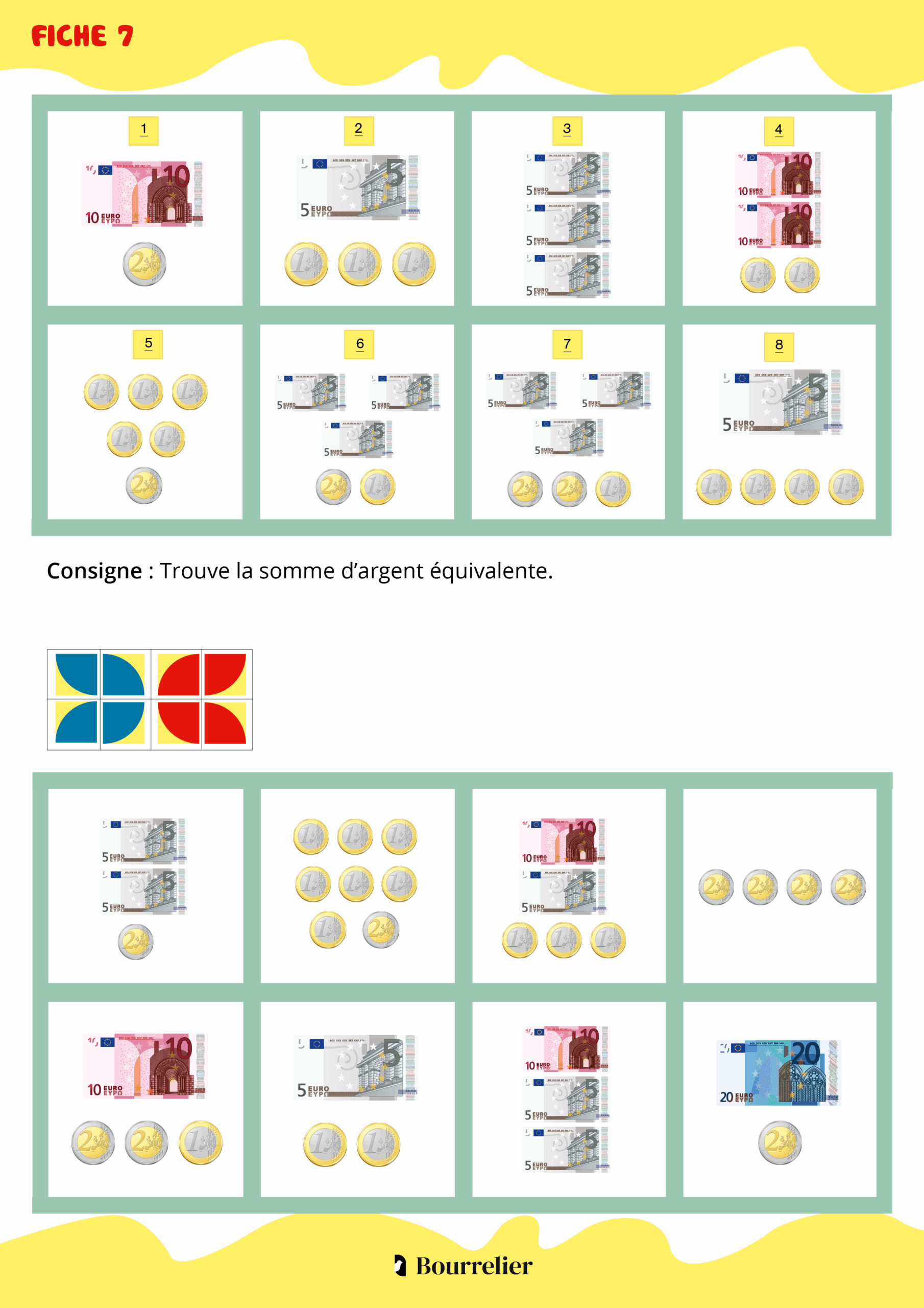 Si le motif correspond au modèle présenté sur la fiche l’élève sait qu’il a réussi l’activité. Si le motif ne correspond pas, il repère les réponses incorrectes et se corrige tout seul.