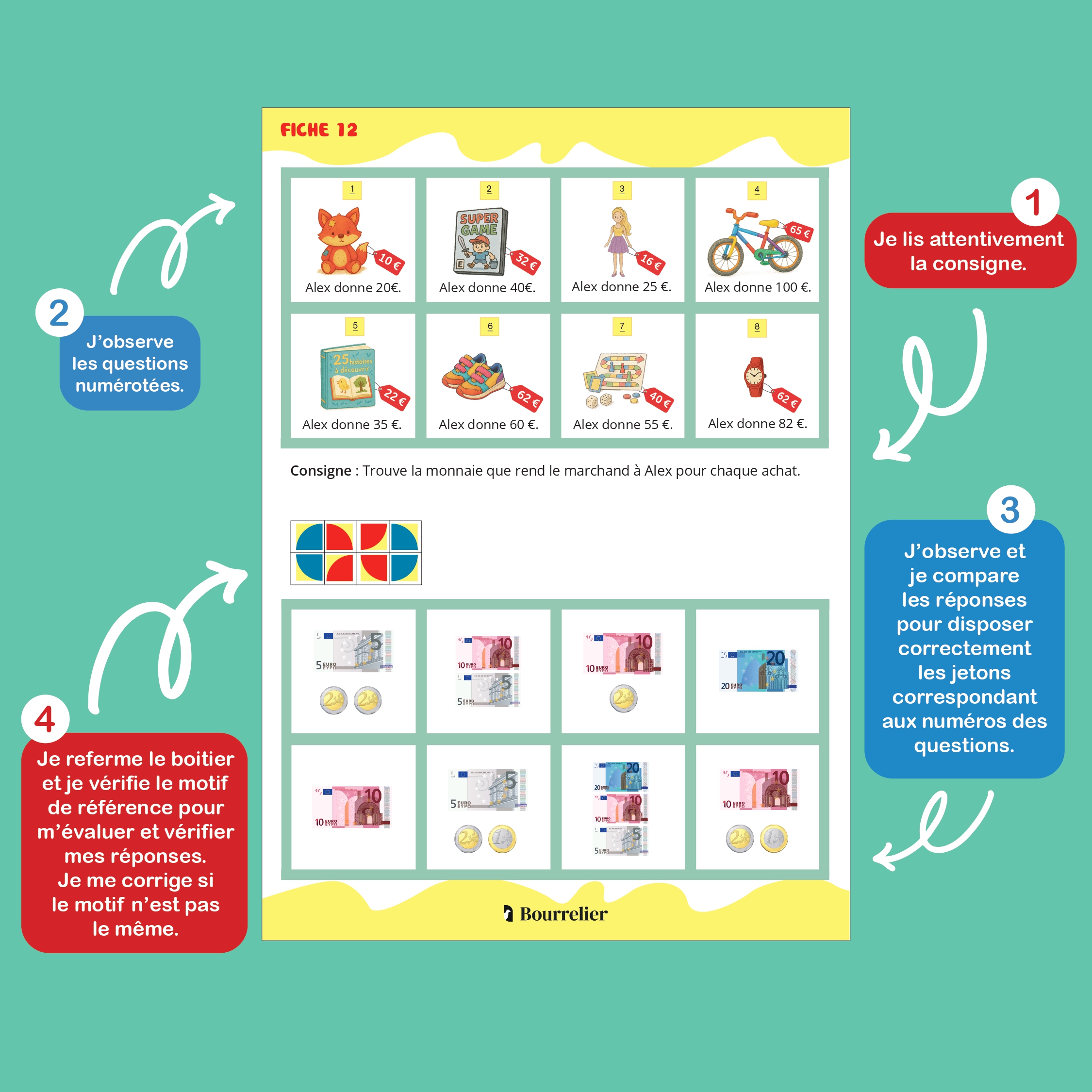 - En autonomie, l’élève répond aux questions d’une fiche pédagogique à l’aide du boitier. Il place les jetons numérotés sur les cases réponses.