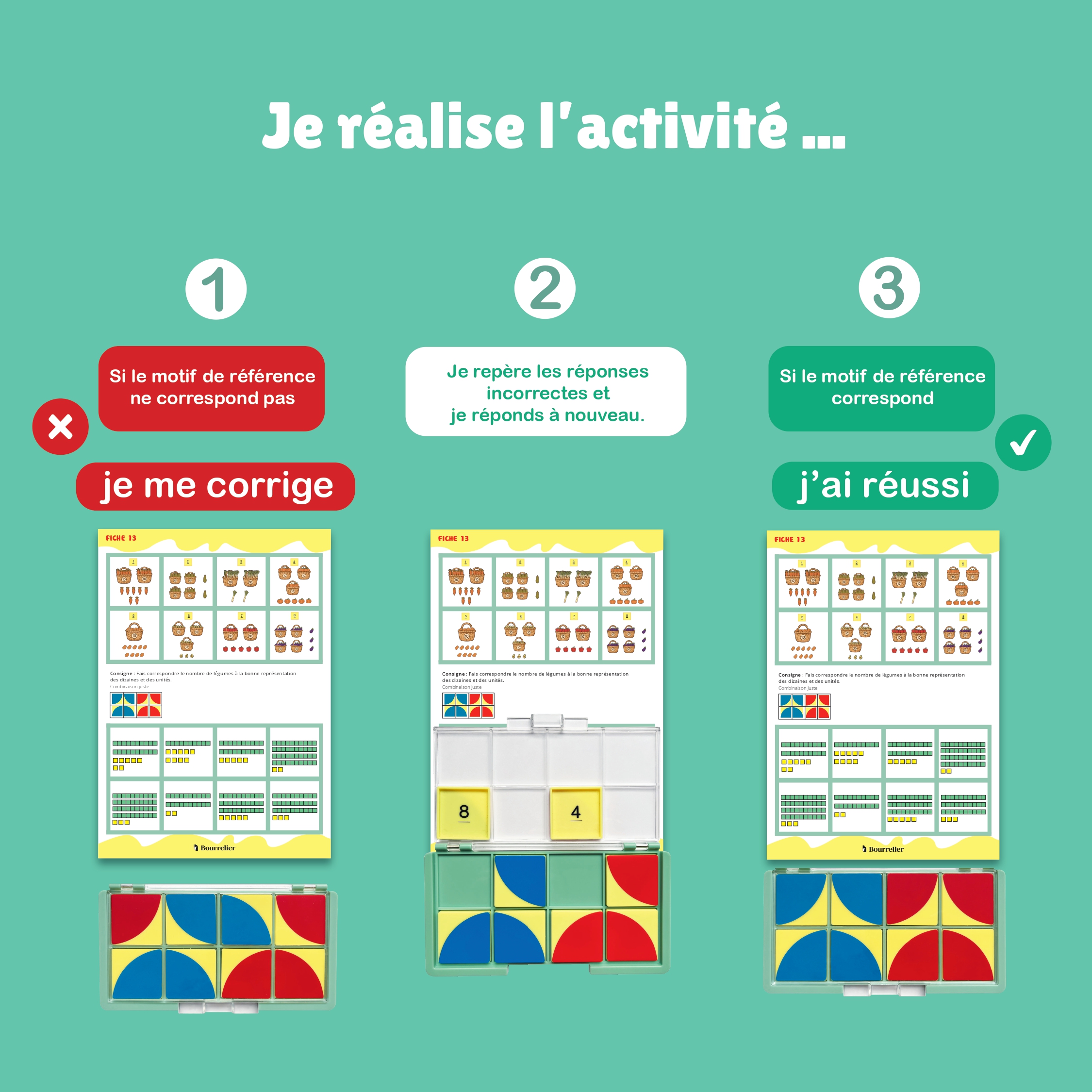 - Si le motif correspond au modèle présenté sur la fiche l’élève sait qu’il a réussi l’activité. Si le motif ne correspond pas, il repère les réponses incorrectes et se corrige tout seul.